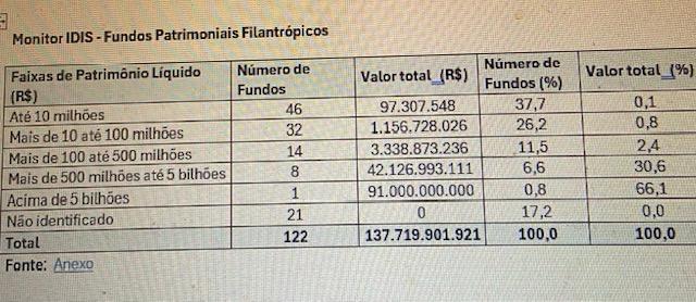 Inicialmente fui revisitar (21.10.2025) o Monitor de Fundos Patrimoniais no Brasil, iniciativa do IDIS e da Coalizão pelos Fundos Filantrópicos, para o acompanhamento de endowments em atividade no Brasil. Nessa plataforma, os dados são “constantemente” atualizados, de modo voluntário por meio de questionário respondido pelo gestor de cada Fundo.