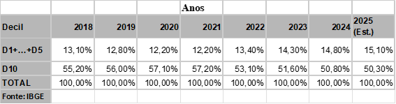 Essa taxa, que era de 12,2% em 2018, atingiu o auge em 2020 e 2021 (na casa dos 14%) com a crise da Covid, e de lá para cá vem caindo direto, chegando a 7,8% (2023), 6,6% (2024) e 5,9% (estimativa 2025).