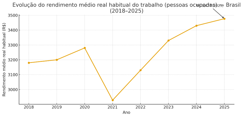 Por outro lado, os indicadores do mercado de trabalho no Brasil parecem evidenciar que em 2025 vivemos uma situação de continuidade conjuntural com viés positivo, na contramão dessas mudanças disruptivas que estamos presenciando, de destruição de muitos postos de trabalho mais do que a criação de novos. Senão, vejamos a evolução recente de alguns desses indicadores, segundo o IBGE / PNAD Contínua.