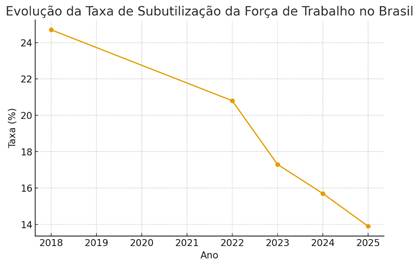 Como mostra o gráfico abaixo, a taxa de subutilização da força de trabalho veio em rota declinante desde 2018 (24,7%) para 20,8% (2022), e 13,9% (2025 / trim.agosto-outubro).